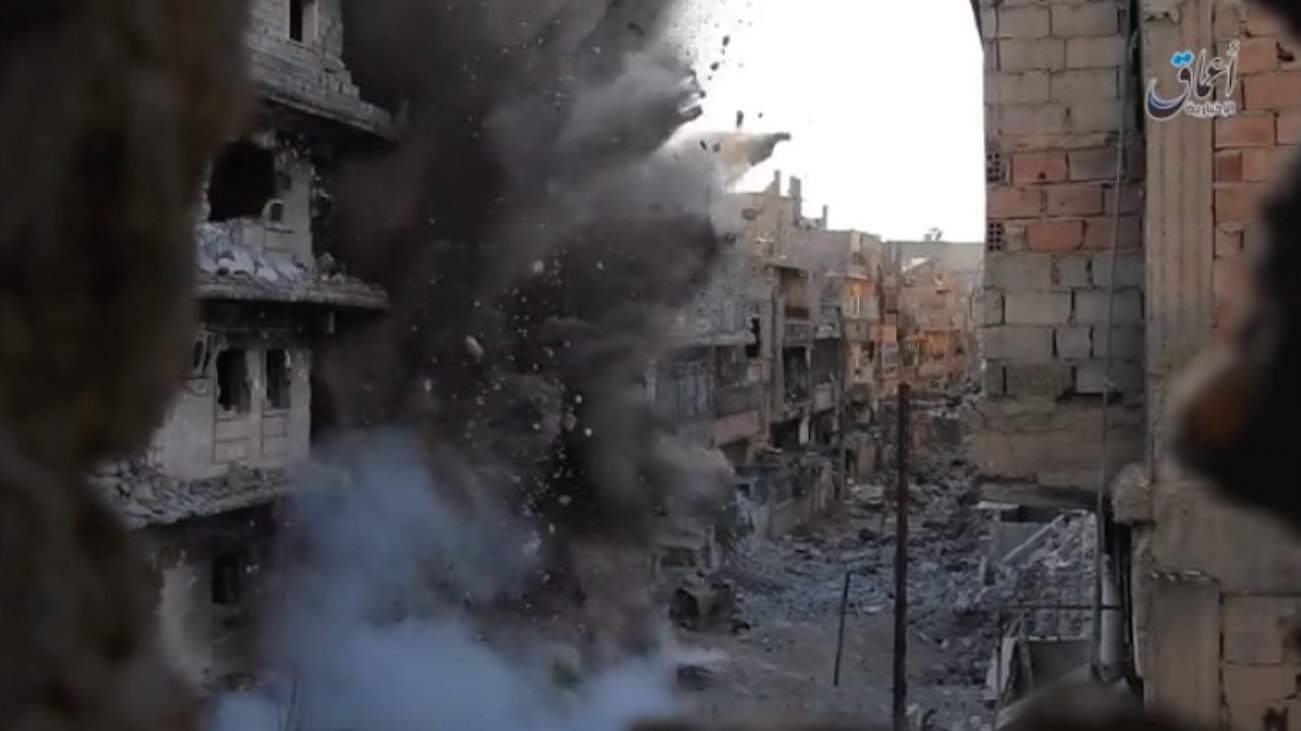 The VBIED detonates, scattering the defenders. Filmed by the ISIS media network Al-Hayat.